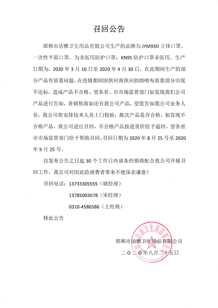邯鄲市潔雅衛(wèi)生用品有限公司生產(chǎn)的品牌為JYM93D立體口罩一次性平面口罩,為非醫(yī)用防護(hù)口罩;KN95 防護(hù)口罩非醫(yī)用。生產(chǎn)日期為:2020年3月10日至2020年4月30日,在此期間生產(chǎn)的部分產(chǎn)品有質(zhì)量問(wèn)題,在疫情期間因供應(yīng)商供應(yīng)的熔噴布質(zhì)量部分出現(xiàn)不達(dá)標(biāo),造成產(chǎn)品不合格。望各省、市市場(chǎng)監(jiān)管部門如發(fā)現(xiàn)我們公司產(chǎn)品進(jìn)行告知,各銷售商如還有我公司產(chǎn)品,望您告知我公司業(yè)務(wù)人員,我公司將安排技術(shù)人員上門檢驗(yàn),批次產(chǎn)品是否合格,如發(fā)現(xiàn)不合格產(chǎn)品,我公司進(jìn)行召回,不合格產(chǎn)品按進(jìn)貨價(jià)給予退回。望各省市市場(chǎng)監(jiān)管部門給予幫助召回召回日期為2020年8月25號(hào)至2020年9月25號(hào)